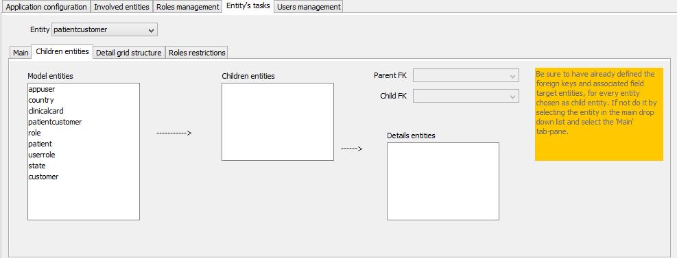 This pane defines which other entities are directly related to the currently selected entity for the purpose to present, within the data form page, one or more details data grids related to the entity's main data (that's why the 'children' word was used).