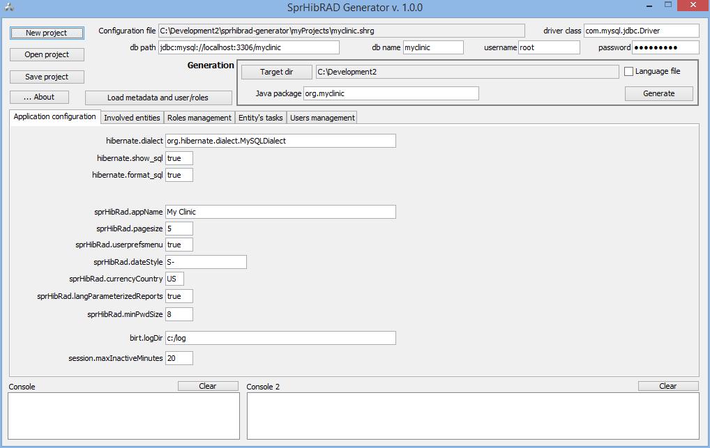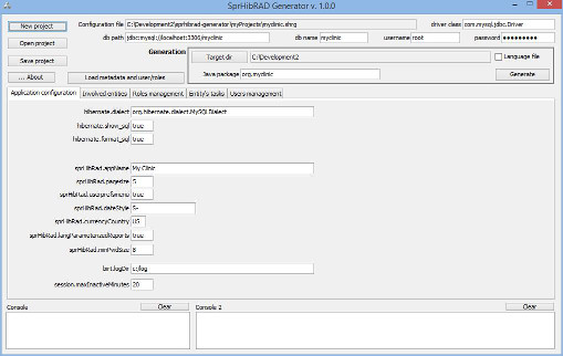 The 'Application configuration' tab-pane doesn't require explanation for 'sprHibRad'-prefixed properties more than what said about 'Application layout'; the developer of Spring/Hibernate applications certainly knows about the other properties. Below are the descriptions for the other pane.